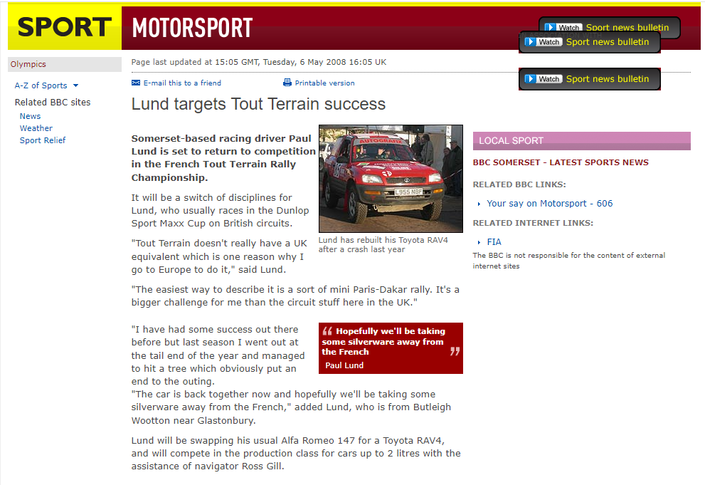 "I have had some success out there before but last season I went out at the tail end of the year and managed to hit a tree which obviously put an end to the outing. The car is back together now and hopefully we'll be taking some silverware away from the French," added Lund, who is from Butleigh Wootton near Glastonbury.